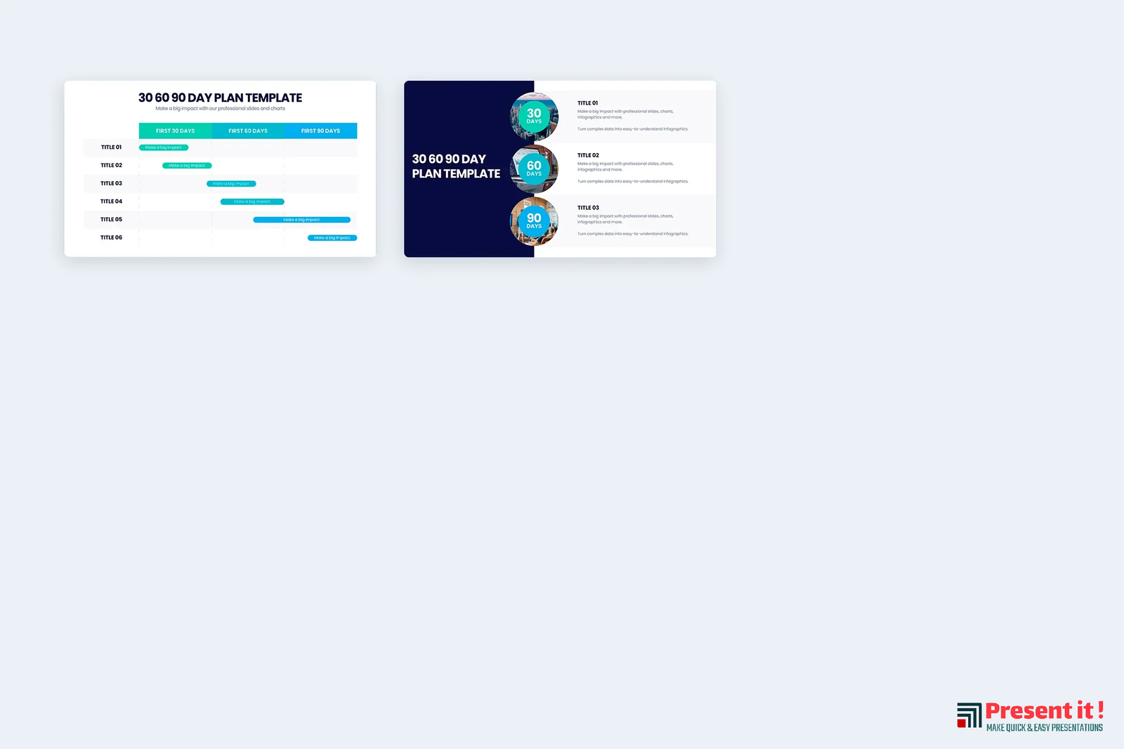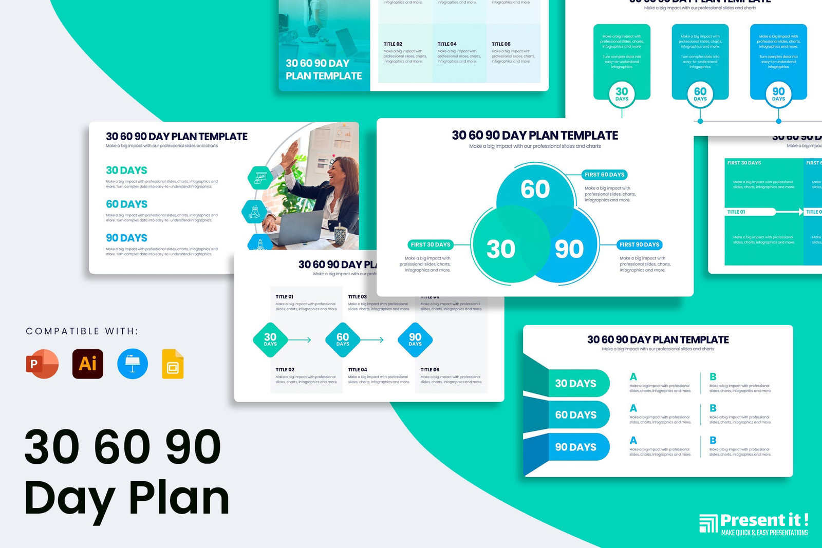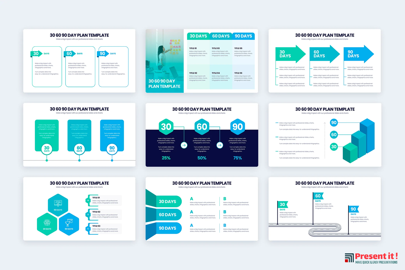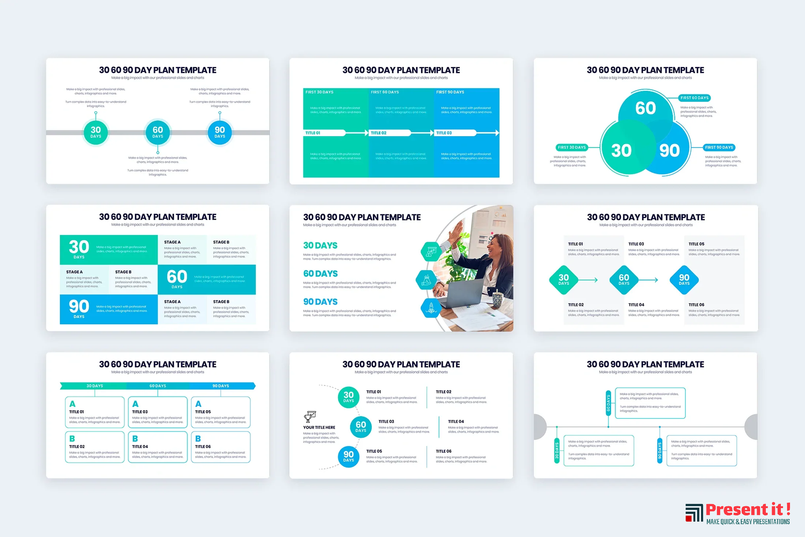 Welcome to the 30-60-90 Day Plan! Whether you’re launching a new business, taking on an exciting new project, or simply trying to better organize your goals and tasks, this plan has all the tools you need to succeed. Our 30-60-90 Day Plan is designed to help you strategize and prioritize your objectives through templates, infographics, and PowerPoint slides that are easy to customize and use. Our 30 60 90 Day Plan templates help you break down long-term goals into achievable chunks. You can create step-by-step roadmaps of progress that are both measurable and trackable. Layer by layer our infographics will uncover new opportunities while laying out plans for the future. With our PowerPoint slides you can easily present your strategies in a visual way; solidifying ideas with clever visuals and captivating graphics. Organizing your ambitions has never been easier than with our 30-60-90 Day Plan. Create meaningful plans for success in no time at all. Get started now, and see what possibilities this plan holds for you!